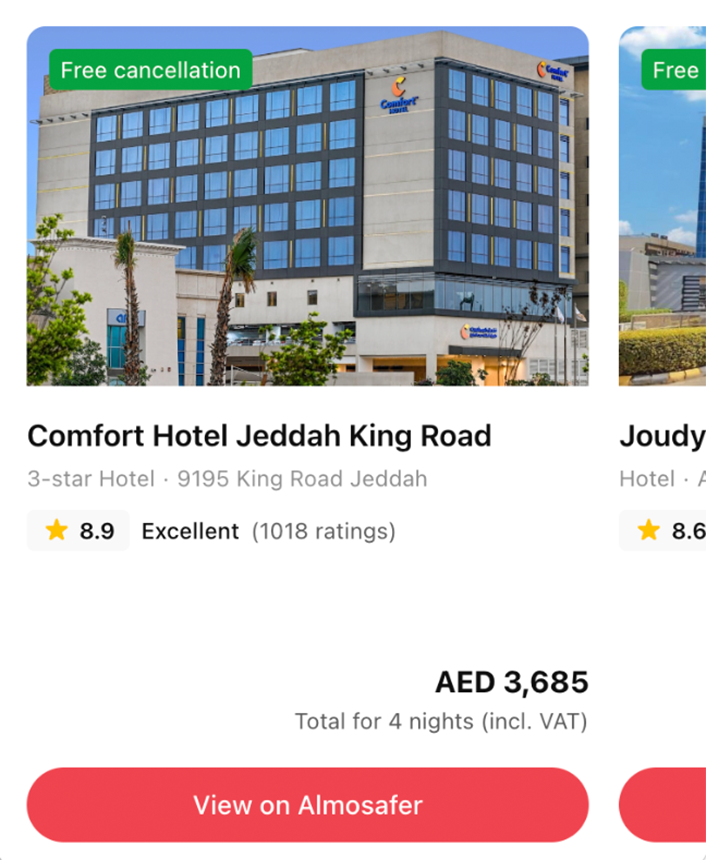 Finding your perfect stay has never been easier with the Almosafer.com ChatGPT app. "Almosafer, find me a 4-star hotel in Dubai with free cancellation for next weekend." You got it. Check out real guest reviews, photos, and prices, all in one place. Spotted something you love? Tap "View on Almosafer.com" to explore more and book with instant confirmation. With 24/7 customer support, we're always here to help. Add the Almosafer.com app and start planning your next getaway today.