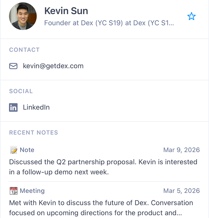 Manage your Dex CRM Dex is a personal CRM that helps you stay on top of your relationships. Use this app to search your contacts, log meeting notes, set follow-up reminders, organize people with tags and groups, and track custom details — all through conversation. Whether you're preparing for a meeting or catching up on who you haven't talked to in a while, Dex keeps your network at your fingertips