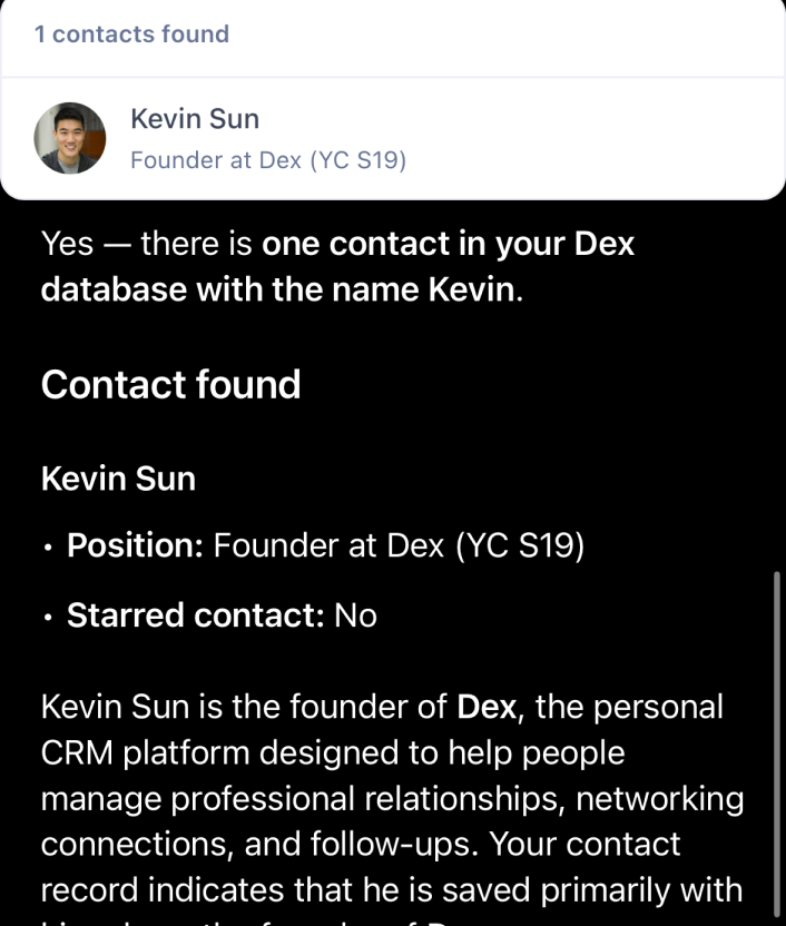 Dex is a personal CRM that helps you stay on top of your relationships. Use this app to search your contacts, log meeting notes, set follow-up reminders, organize people with tags and groups, and track custom details — all through conversation. Whether you're preparing for a meeting or catching up on who you haven't talked to in a while, Dex keeps your network at your fingertips
