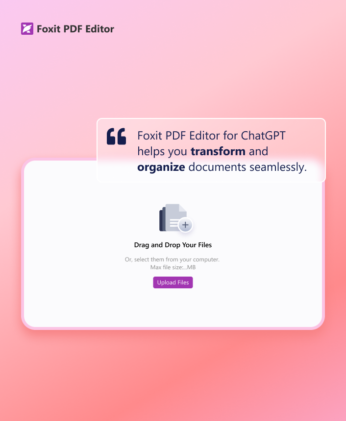 Edit and Share PDFs easily Foxit PDF Editor for ChatGPT helps you manage and transform PDFs seamlessly. Upload, delete, or compare documents; creat