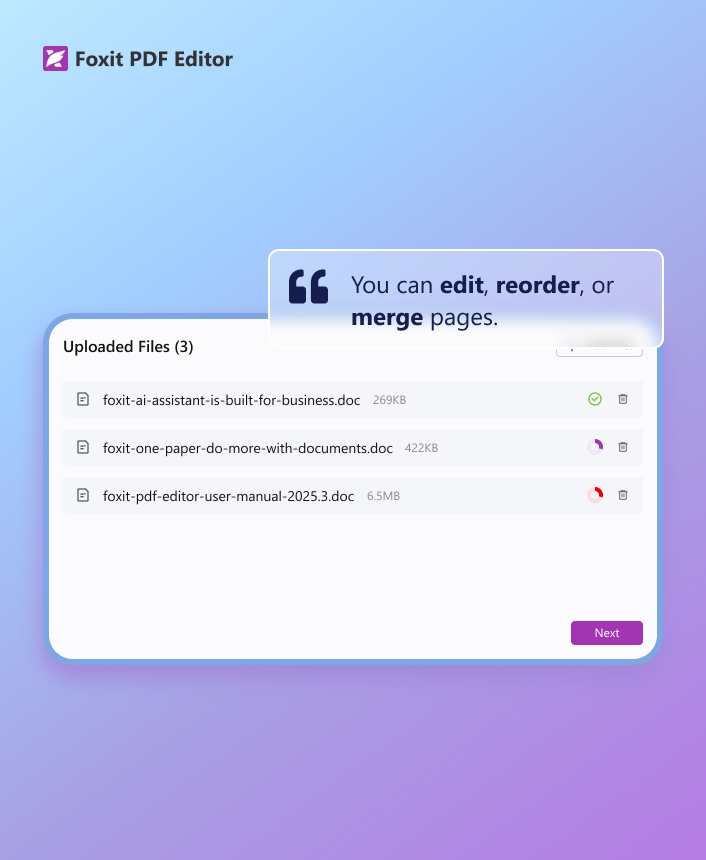 Edit and Share PDFs easily Foxit PDF Editor for ChatGPT helps you manage and transform PDFs seamlessly. Upload, delete, or compare documents; create shareable links; edit, reorder, rotate, split, or merge pages; convert files to and from various formats; and compress or linearize PDFs—all within ChatGPT. Build organized packets in seconds — ready for students, professionals, or anyone needing fast PDF solutions without leaving the chat.