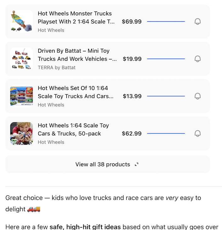 Penny in ChatGPT helps you find great products and keep tabs on prices - without leaving the chat. Tell Penny what you’re shopping for (or upload a photo to find similar items), browse options, and ask questions to choose the right one. When you find something you like, Penny can start price tracking so you’ll know if the price changes. For example, try: “Penny, find cool funky socks,” “Penny, find shoes like this” (with an image), or “Penny, start price tracking the jacket I liked best.”