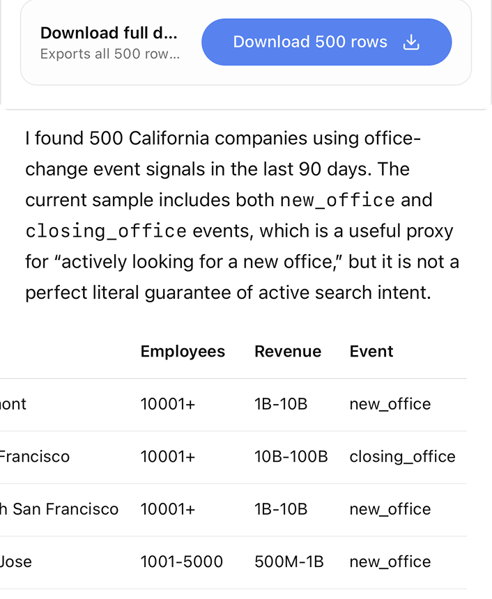 Vibe Prospecting turns your chat into a full B2B intelligence engine. Search any company or professional to instantly access verified emails, phone numbers, roles, growth signals, tech stack data, business events, and website changes—without leaving the conversation. Use Vibe Prospecting to find qualified leads, research prospects, craft personalized outreach, or identify talent in seconds. Powered by a complete enrichment hub, Vibe Prospecting delivers fresh, compliant B2B data directly inside your chat so you can move faster from insight to action.